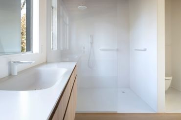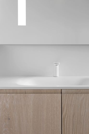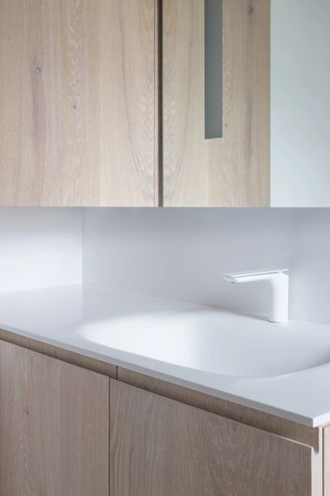 The kitchen features flush-mounted appliances and cabinets, with no applied handles to detract from the clean and streamlined look of the space. Instead, the "c" rail handles are routered into the cabinetry, creating a sleek and modern look that is both functional and beautiful.