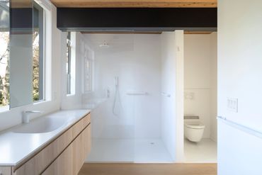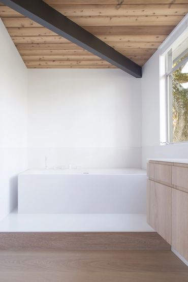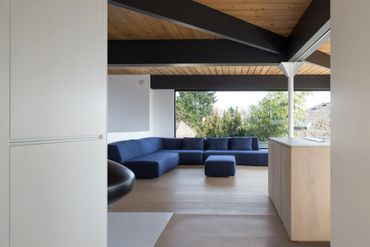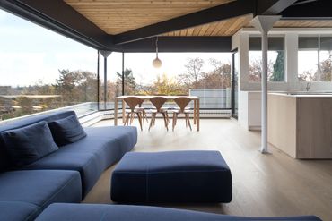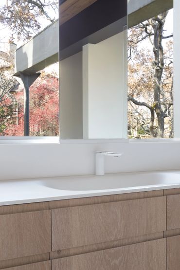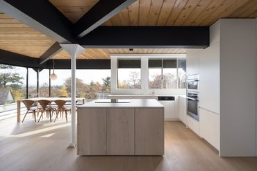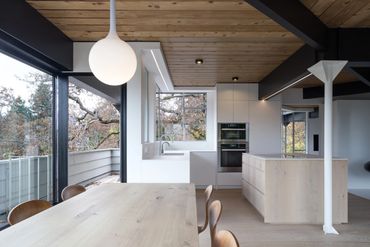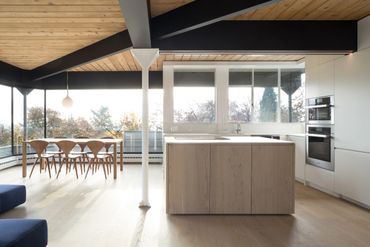 The kitchen is surrounded by historical Gary Oak trees, which can be seen from the windows. The tree branches reaching up and surrounding the space give the kitchen a unique and beautiful feel, like a tree house nestled in the forest.
