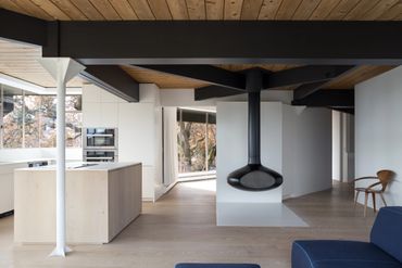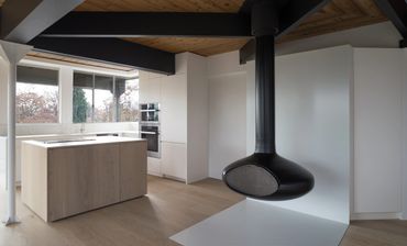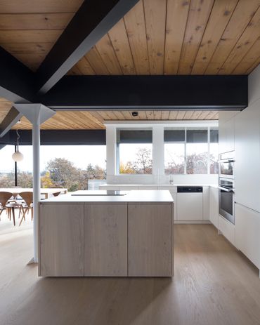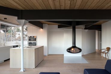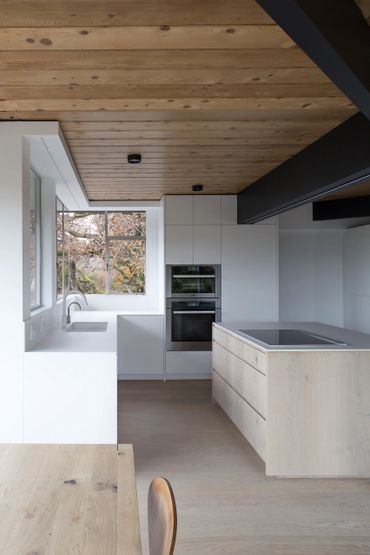 Welcome to this beautifully designed modern kitchen, where form and function blend seamlessly to create a space that appears to be an integral part of the building's physical structure. The architect has taken great care to ensure that the kitchen fits perfectly with the surrounding space, with exposed beams and posts that add to the loft-like feeling of the room.