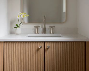 The countertops are a simplistic white quartz, providing a clean and modern look. The white quartz complements the warm tones of the wood and adds a touch of sophistication to the space. The handles are all chrome, with classic lines that reflect the square lines in the cabinets, adding a touch of elegance to the space.