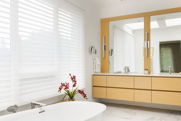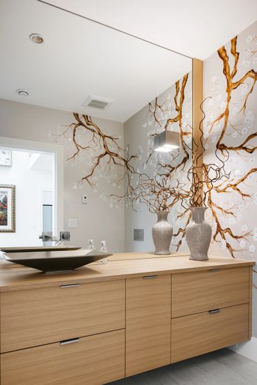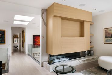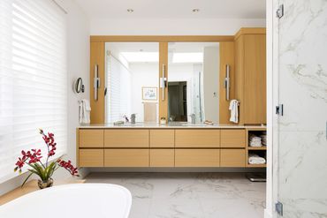 The island features double waterfalled quartz countertops with mitered waterfall edges that drop to a dining-height seating area, creating a seamless flow. This installation job is not an easy task, but the end result is well worth it. The white oak cabinetry and dramatic veined stone are repeated throughout the home, creating a cohesive and stylish design.
