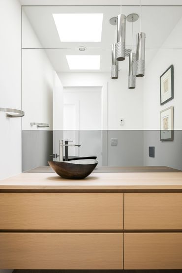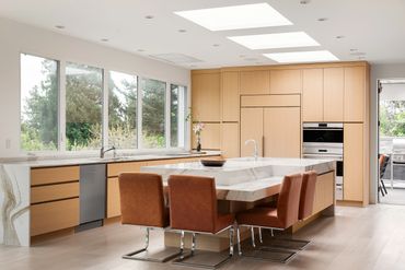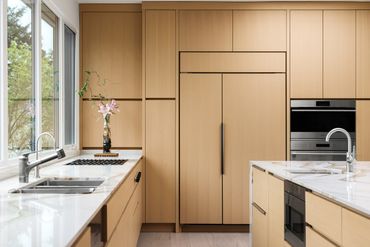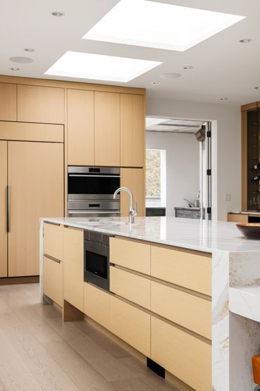 The sleek and modern aesthetic of the kitchen is balanced with the warmth of the wood and the organic feel of the stone. The white oak cabinetry is carefully crafted to showcase the natural beauty of the wood, with minimalistic hardware that adds to the clean and sophisticated look of the space.
