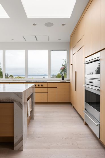 This home is located at a high vantage point, overlooking the ocean with breathtaking panoramic views that are fully embraced by the design of the kitchen. The minimalist approach of the kitchen design allows the beauty of the natural surroundings to shine through, while the white oak adds warmth and depth to the space.